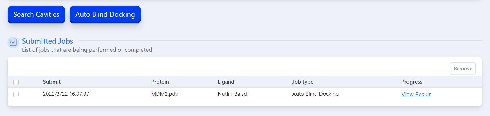 Users can submit one "Search Cavities" job or "Auto Blind Docking" job at a time. Once the task is completed, you can click on the "View Result" in the task list to jump to the result page, then you can view or download the results under the result page. Or you can delete the task output from our server by clicking the "Remove" button on the task list. Additional, We will send the result email if users enter the eamil address.