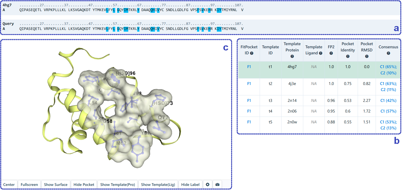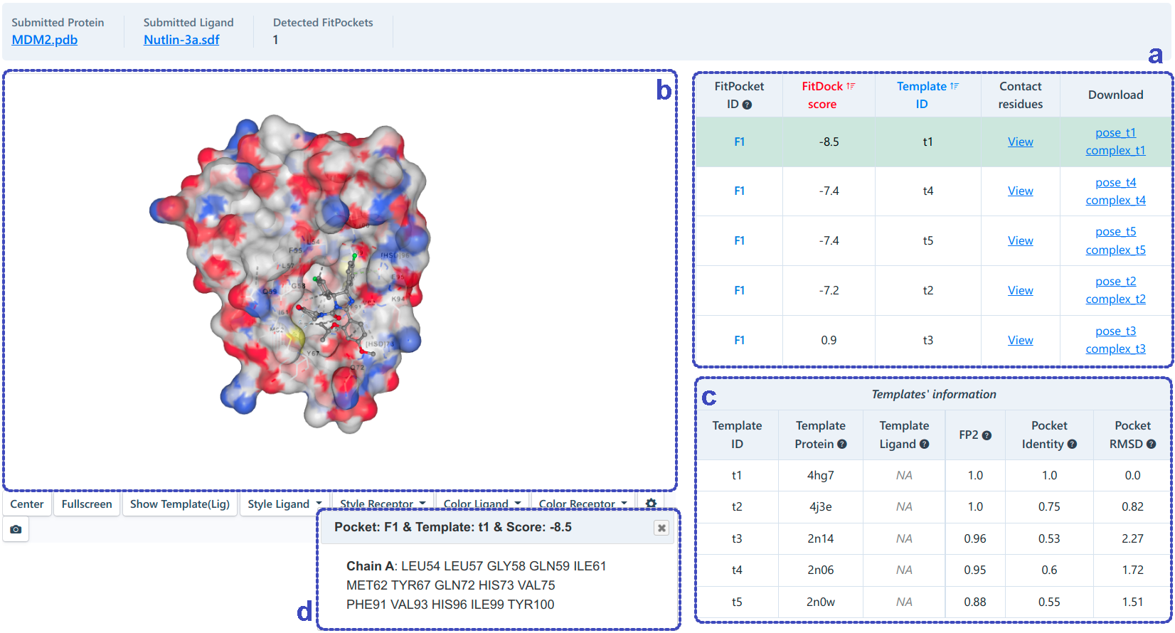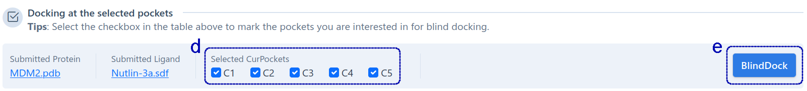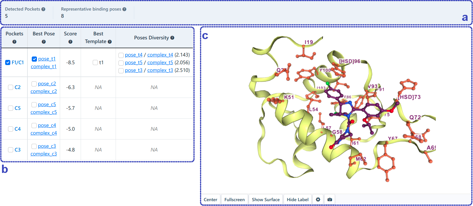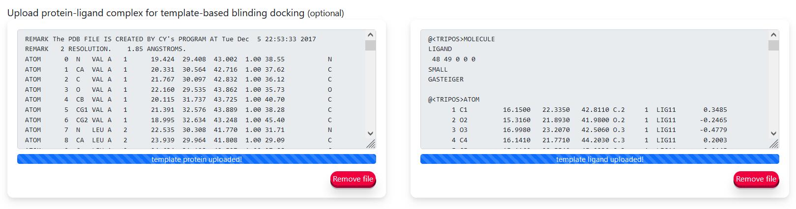 To meet the different demands of users, we designed two sets of task flow with different objectives, namely "Search Cavities" and "Auto Blind Docking". The former will perform cavity detection according to the protein and ligand submitted by the user, including structure-based cavity detection and template-based cavity detection (performed in the case of having homologous templates). The latter will automatically use the above two programs to perform cavity detection and then docking based on the detected pockets. Submission methods and notes are as follows: