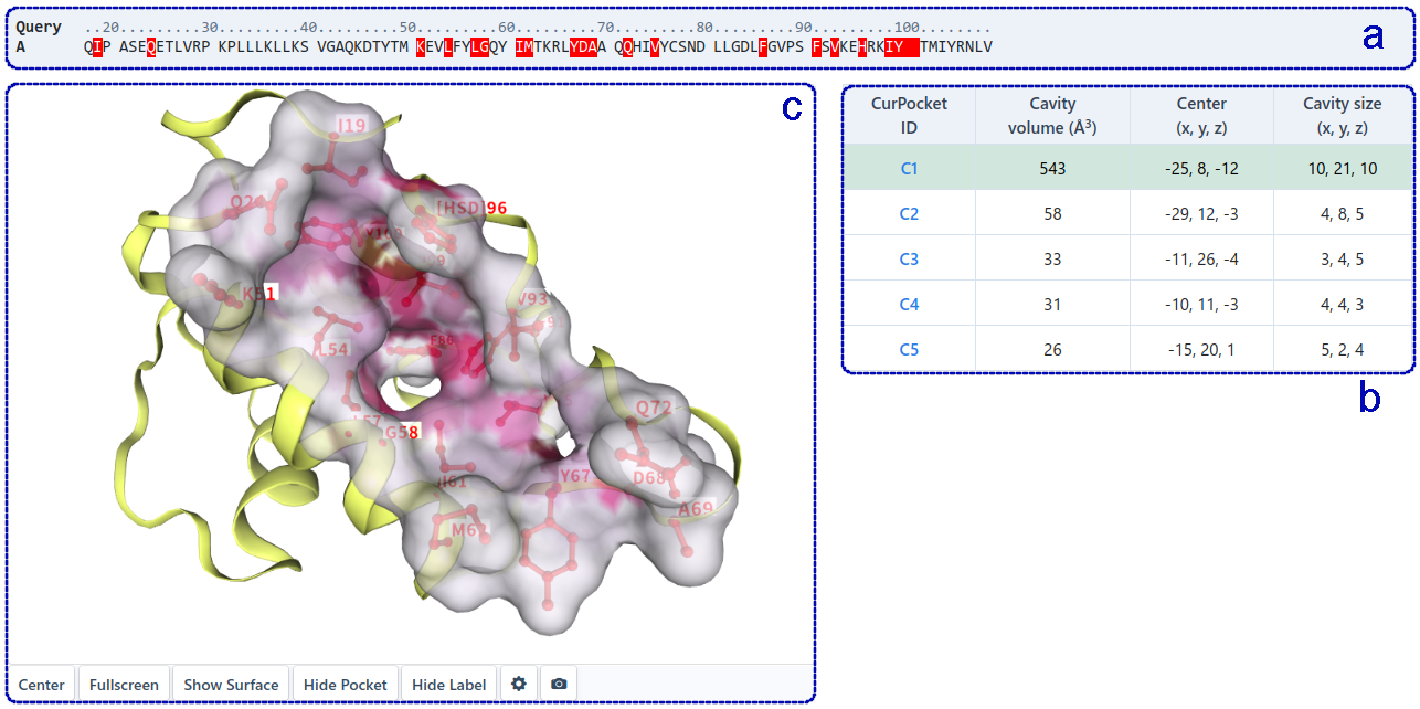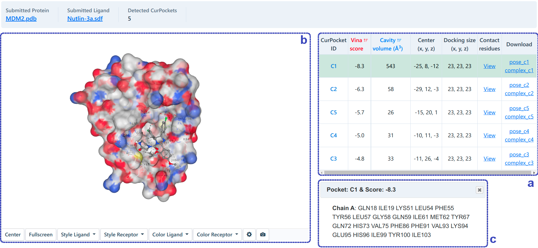 For the two different tasks of "Search Cavities" and "Auto BlindDock", we provide plentiful visualization functions on the results page to help users preliminarily analyze the calculation results. Users can also download the data locally for further analysis.