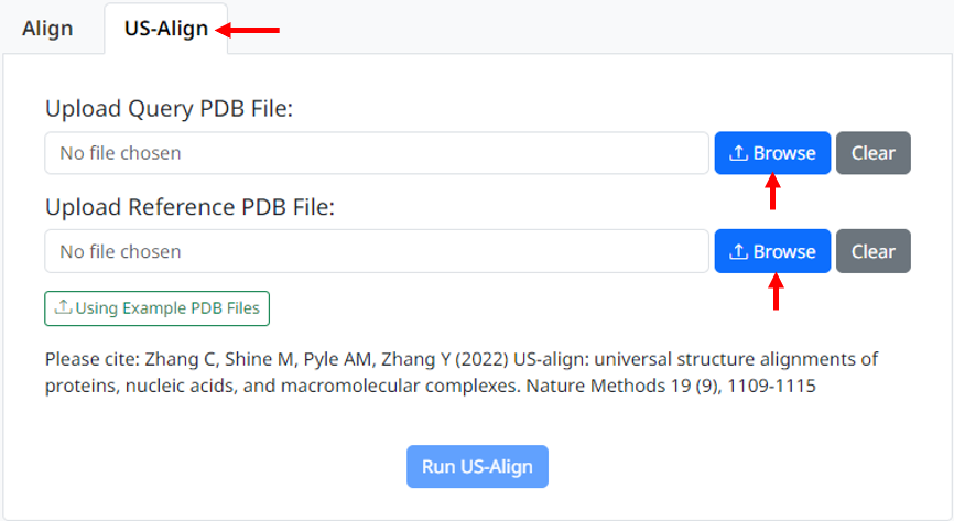 1. Click on the US-align tab box on the right of align to enter the US-align page. Upload your query PDB and reference PDB files that need to be aligned, the page will check whether the uploaded files meet the requirements