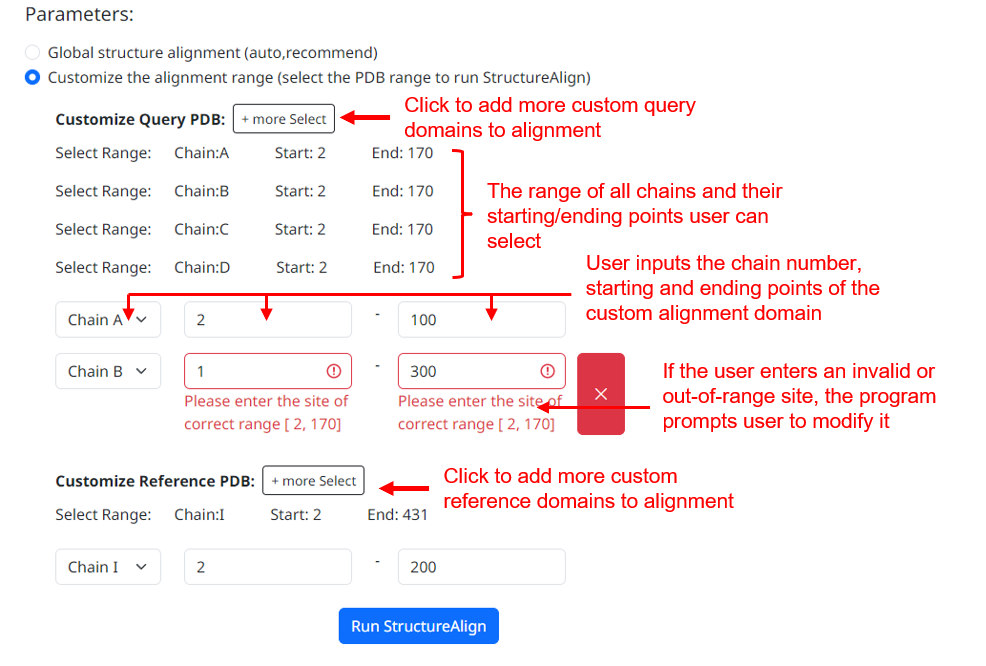 3. If you choose to do a custom range alignment, the page will analyze the PDB file you uploaded and give the custom range parameter input interface. You can select any number of truncated regions for alignment. The page displays a customizable range of chains and starting and ending points that the user's input needs to meet.