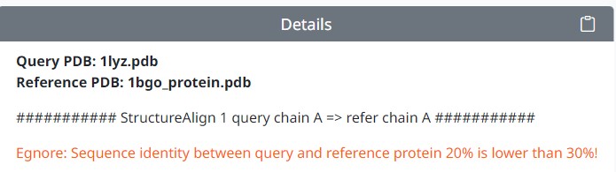 5. If your input alignment range sequence similarity is less than 30% , the program will be difficult to give an accurate alignment conformations, will give the following error message. At this point we recommend that you try US-align instead of align, see 'US-align Tutorial' for more help