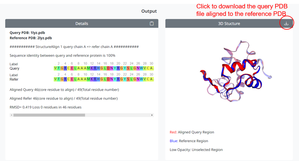 4. After the user inputs correctly and clicks the Run StructureAlign button to submit, the alignment result will be displayed on the webpage. The left box shows the alignment details, including sequence alignment and RMSD value. The 3D conformation overlaid with the query and reference PDB is shown in the box on the right. If you select custom range alignment, the non custom range will be displayed semi transparently. You can click on the download icon to download the aligned query conformation.