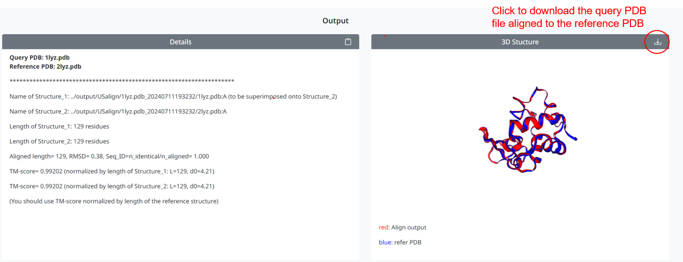 2. When the user clicks the Run US-align button to submit, the page displays the alignment results: in the left box are the alignment details, including the RMSD value and TM-Score; in the right box are the 3D conformations of the query superimposed on the reference sequence. You can click the download icon to download the query conformations superimposed on the reference PDB conformations.