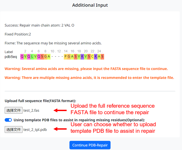 3. If the PDB file you upload is missing several residues, the user needs to provide a complete reference sequence FASTA file for the program to continue the repair. If multiple residues are missing, it is recommended that the user select the option to provide a template PDB file. This allows the program to match the missing regions with the corresponding template structure, making the repaired structure more reasonable.