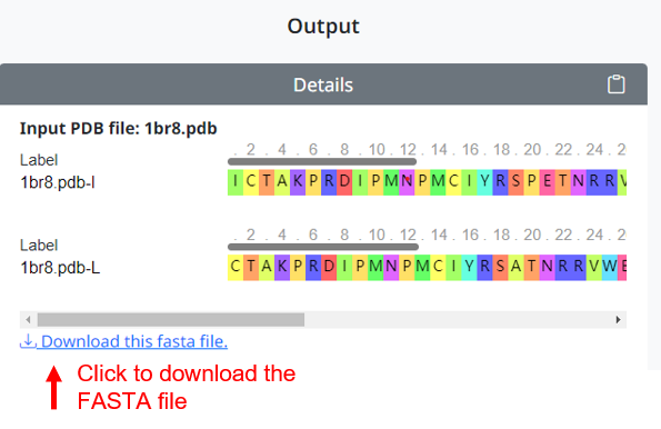2. When the user clicks the 'Run PDB2FAS' button to submit, the page displays the results: the sequence of all extracted chains in the input PDB will be displayed and user can click on the link below to download the transformed FASTA file